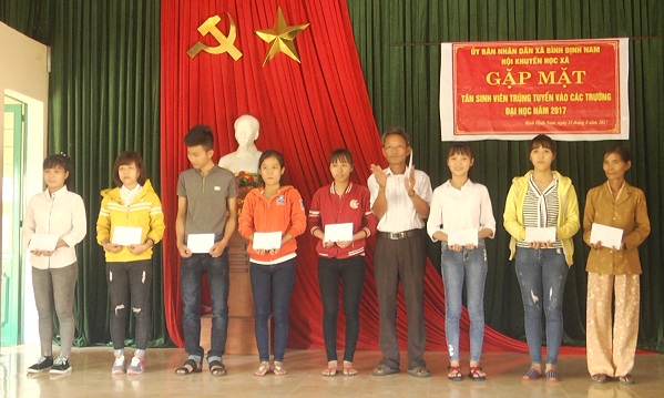 Theo đó, mỗi suất quà trị giá 200.000 đồng. Số tiền trao quà được trích từ nguồn quỹ khuyến học xã. Được biết đây là năm đầu tiên, xã Bình Định Nam có số lượng sinh viên thi đỗ vào các trường Đại học cao nhất từ khi chia tách xã (2008) đến nay. Trong 25 tân sinh viên, có 1 em trúng tuyển vào Đại học Cảnh sát nhân dân thành phố Hồ Chí Minh với số điểm 28,5. Đây là món quà nhằm động viên các em tân sinh viên bước vào năm học mới học tập tốt hơn.
