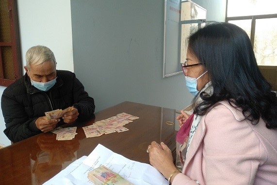 (Ảnh: Người dân có nhà bị thiệt hại do mưa bão vui mừng được nhận tiền hỗ trợ)