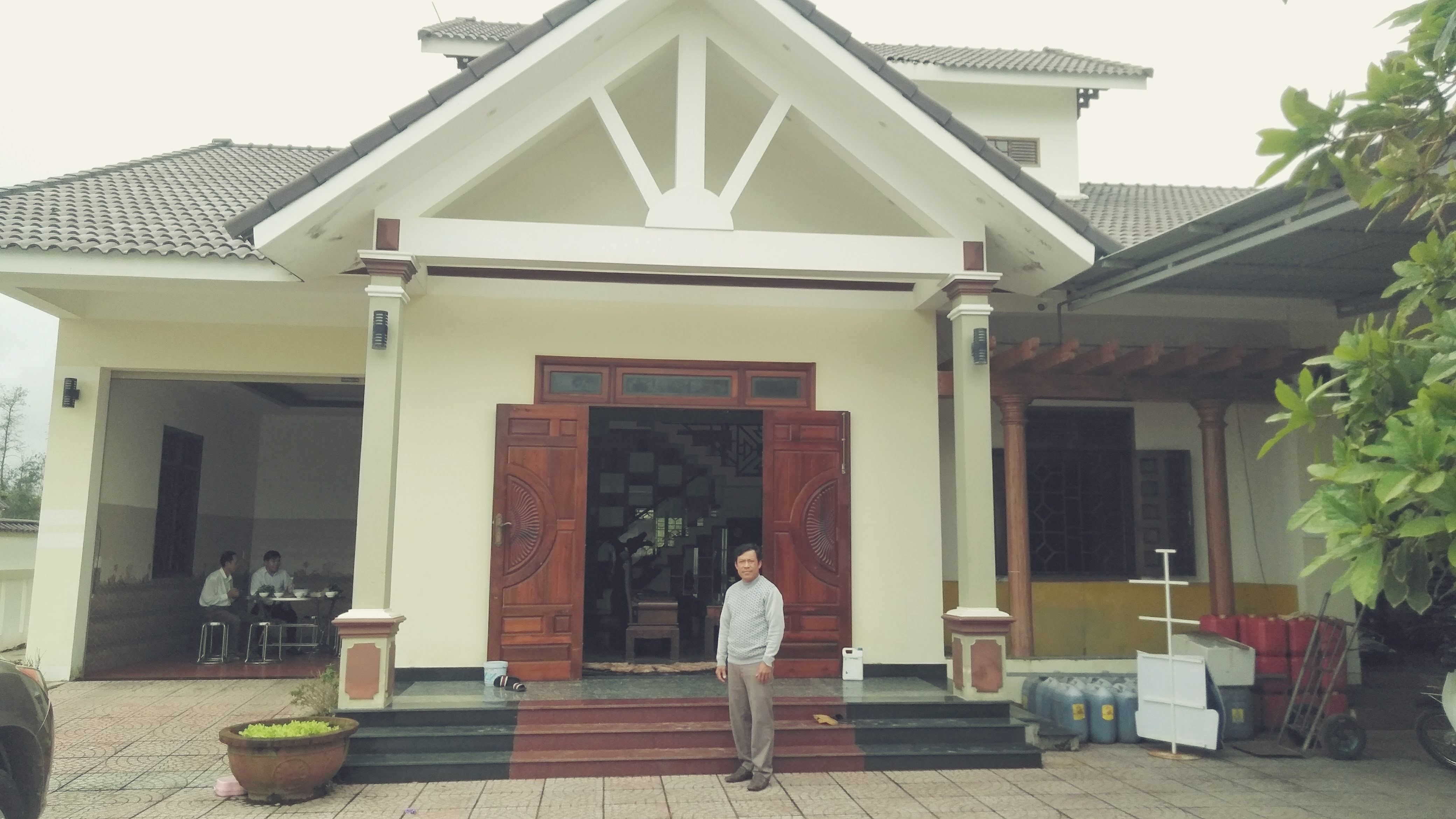 (Ảnh: Anh Cần bên ngôi nhà từ thành quả nuôi tôm)