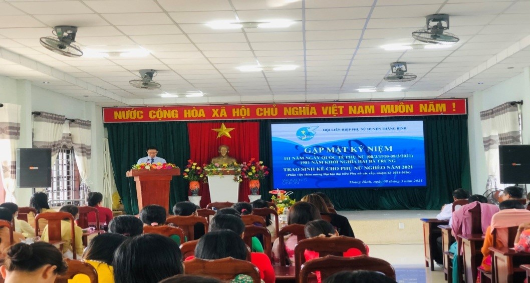 Tại buổi gặp mặt, đồng chí Phan Thị Thuỳ Trang – HUV, Chủ tịch Hội LPHN huyện đã thông qua ý nghĩa truyền thống Ngày quốc tế Phụ nữ 8/3 và khởi nghĩa Hai Bà Trưng và báo cáo kết quả hỗ trợ sinh kế giúp đỡ phụ nữ thoát nghèo trong thời gian qua. Đồng chí Nguyễn Thanh Phong – UVBTV, Trưởng Ban Dân Vận Huyện uỷ thay mặt lãnh đạo huyện ghi nhận và đánh giá cao những hoạt động ý nghĩa của Hội LHPN các cấp trong hoạt động công tác Hội và trong công tác giúp hội viên thoát nghèo bền vững, tặng hoa chúc mừng các chị em dự Hội nghị nhân kỷ niệm ngày Quốc tế phụ nữ và khởi nghĩa Hai Bà Trưng năm nay; đồng thời nhắc nhở Hội Phụ nữ các cấp trong huyện cần tập trung cho công tác chuẩn bị Đại hội Phụ nữ các cấp nhiệm kỳ 2021 – 2026 thành công tốt đẹp.