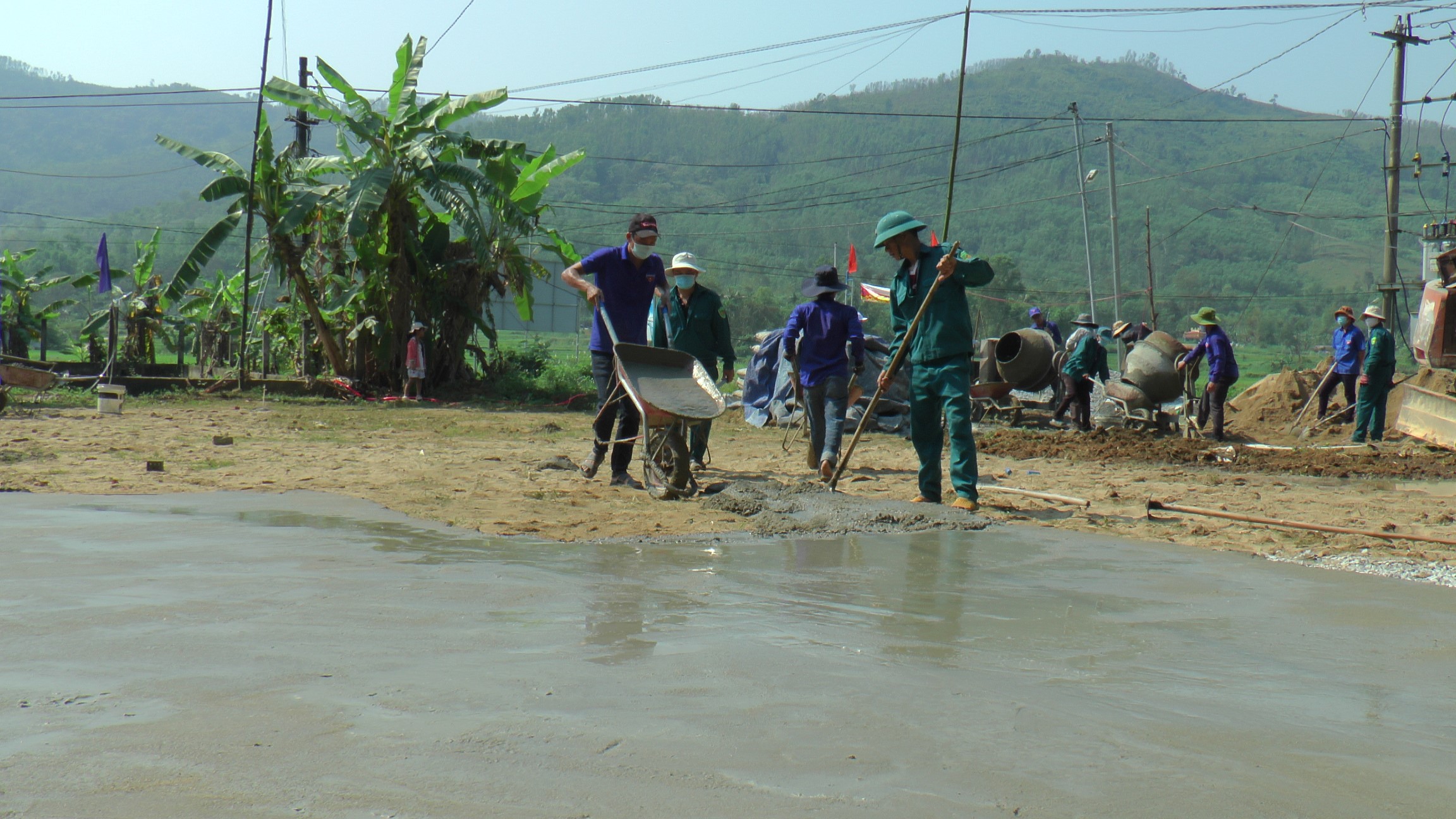 (Ảnh: Đoàn viên thanh niên xây dựng sân bóng chuyền nhà văn hóa thôn Hiền Phong, xã Bình Lãnh)