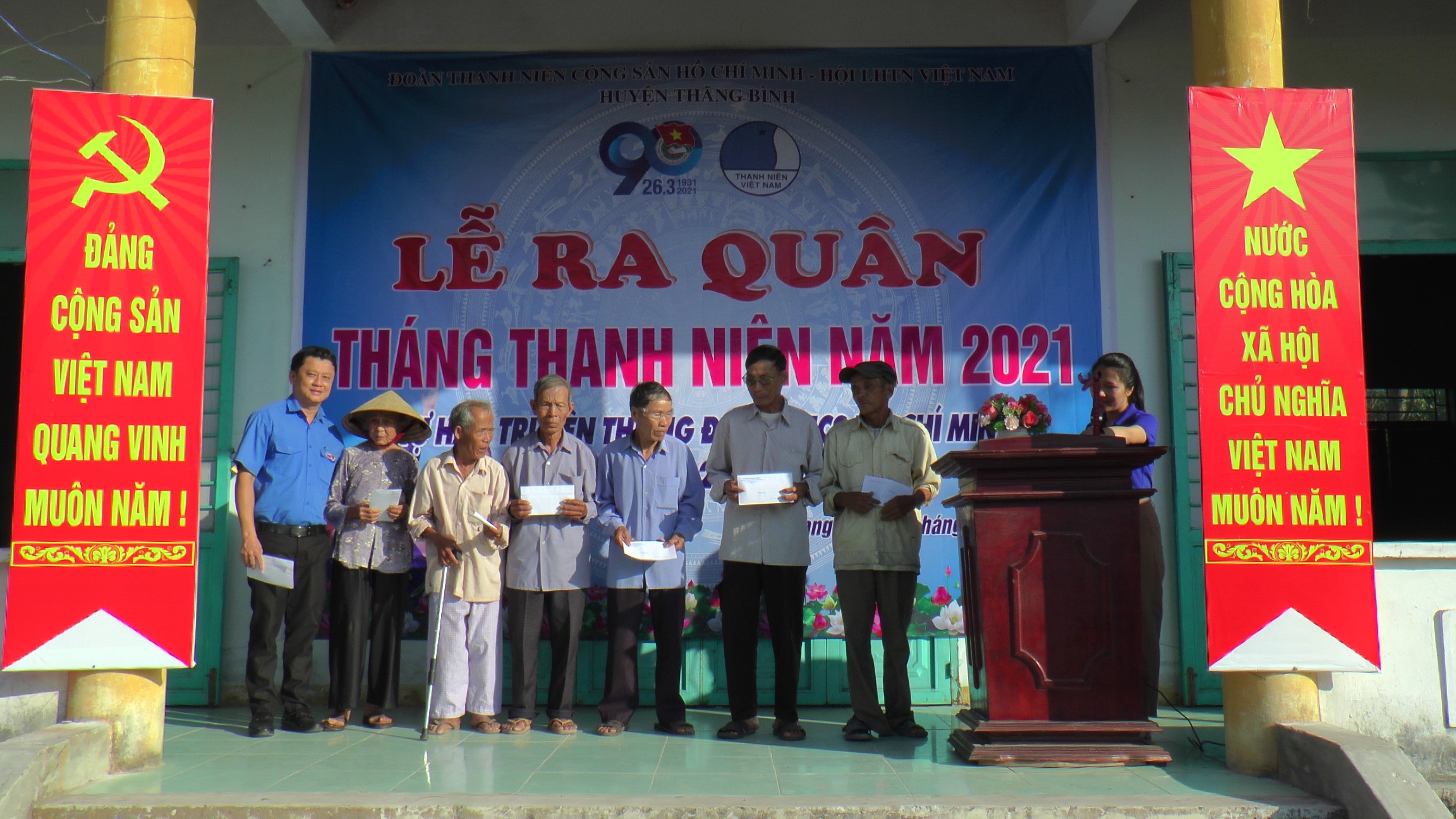 (Ảnh: Huyện đoàn Thăng Bình trao quà cho các hộ có hoàn cảnh khó khăn tại xã Bình Giang)