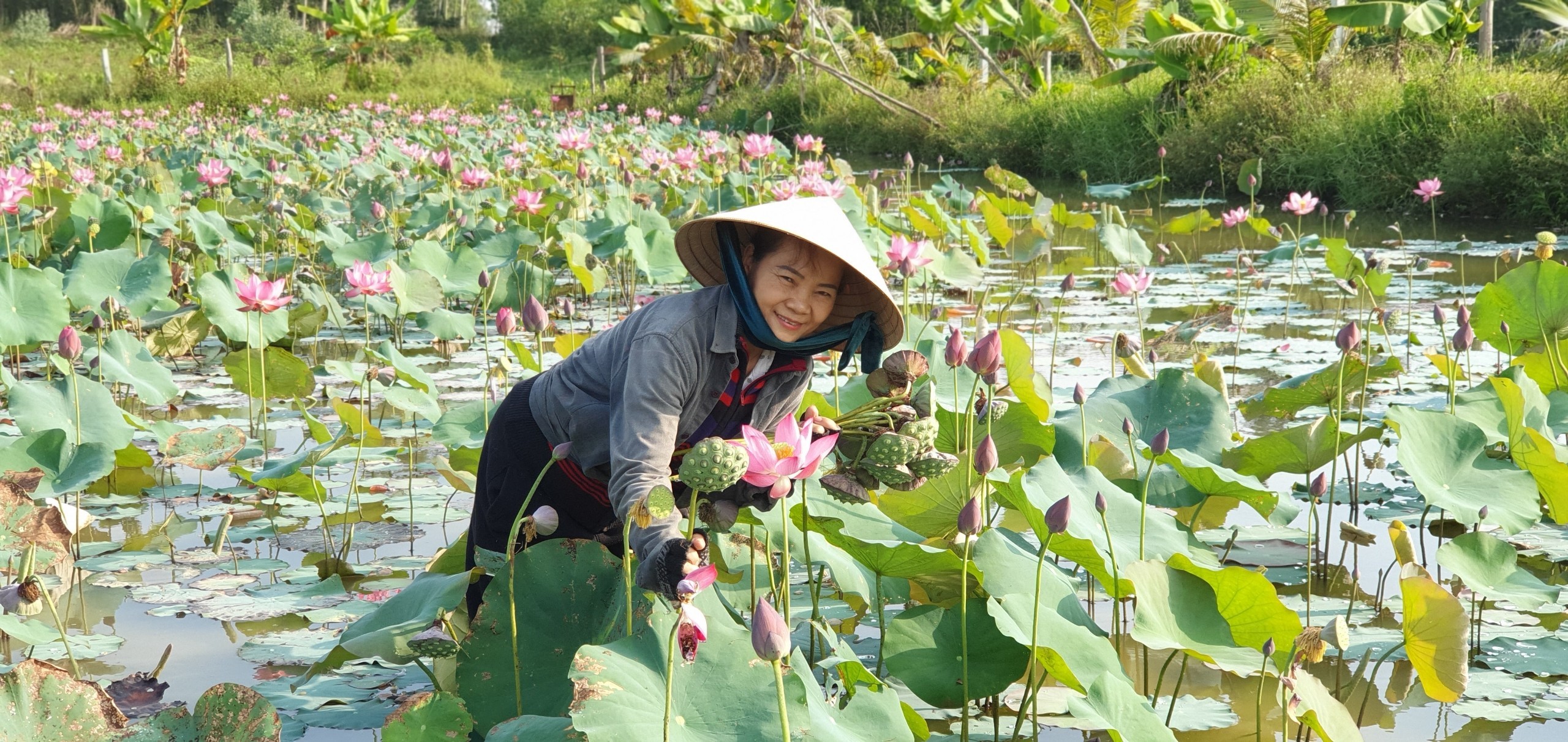 Hình ảnh: chị Luyến đang thu hoạch sen