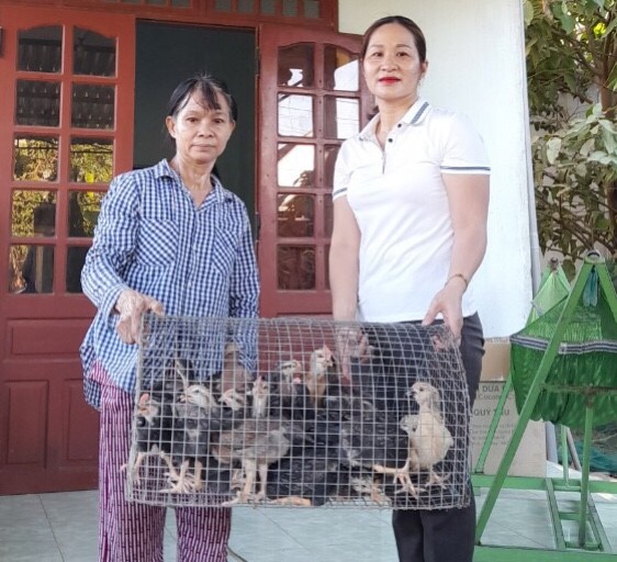 (Ảnh: Trao 50 con gà cho gia đình chị Trà Thị Chín- HVPN thôn Đồng Dương)