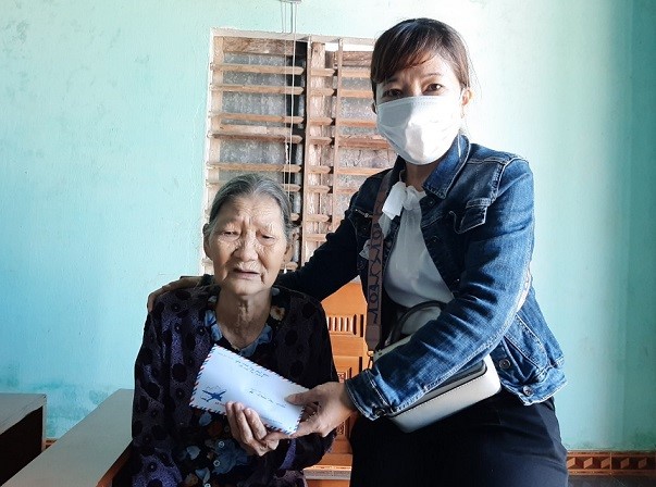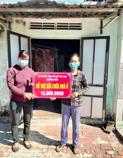 (Ảnh: Đại diện Mặt trận xã Bình Triều trao tiền hỗ trợ sửa chữa nhà cho bà Nguyễn Thị Ninh)