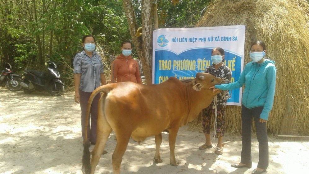 (Ảnh: Trao bò giống cho gia đình chị Bùi Thị Nguyệt-HVPN thôn Cổ Linh)