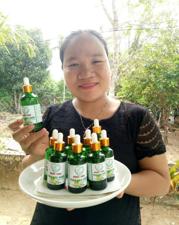 (Ảnh: Chị Yến và sản phảm tinh dầu bưởi)