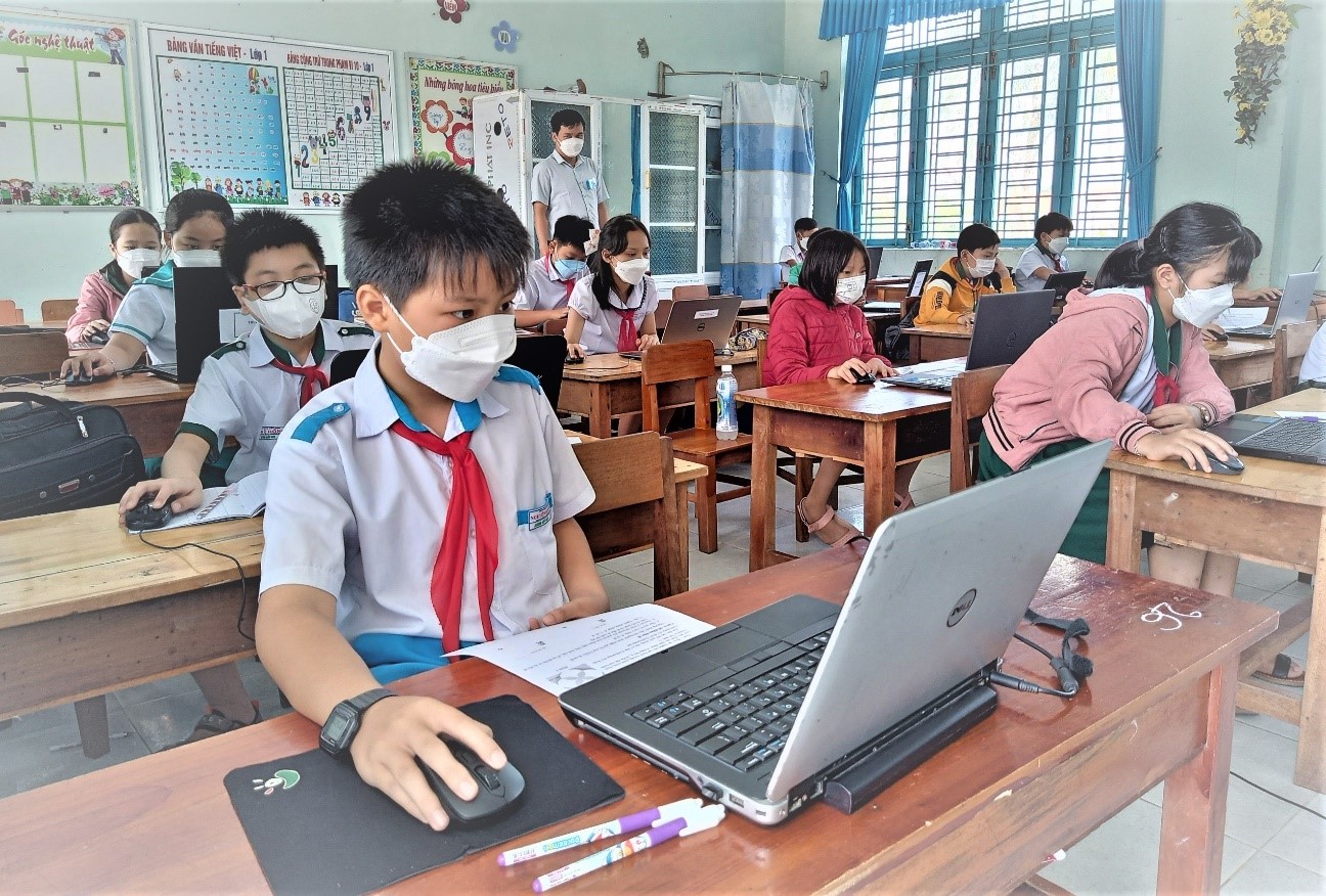 (Ảnh: Hơn 50 học sinh tiểu học tham gia thi ở nội dung kỹ năng tin học)