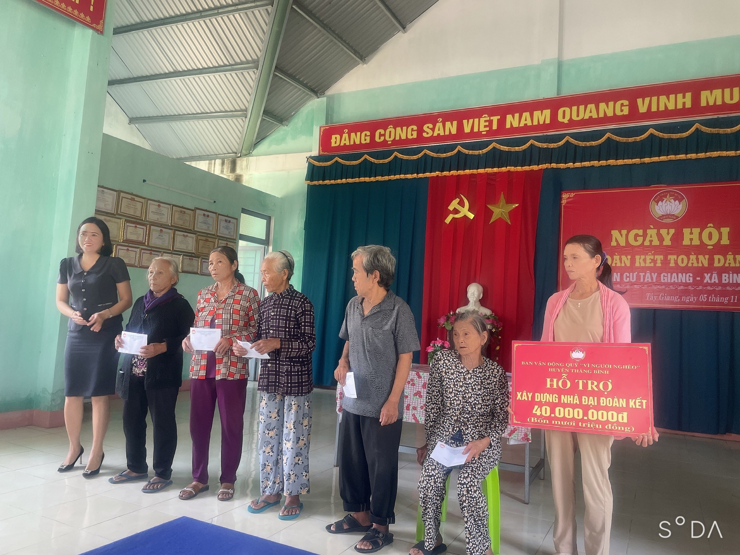 Tại ngày Hội, đồng chí Phan Thị Nhi, UVBTV– PCT UBND huyện đã trao biểu trưng xây dựng nhà đại đoàn kết cho hộ gia đình bà Trịnh Thị Đáng, là hộ cận nghèo khó khăn về nhà ở tại tổ 1 thôn Tây Giang; trao 5 phần quà cho các hộ gia đình có hoàn cảnh khó khăn trên địa bàn thôn.