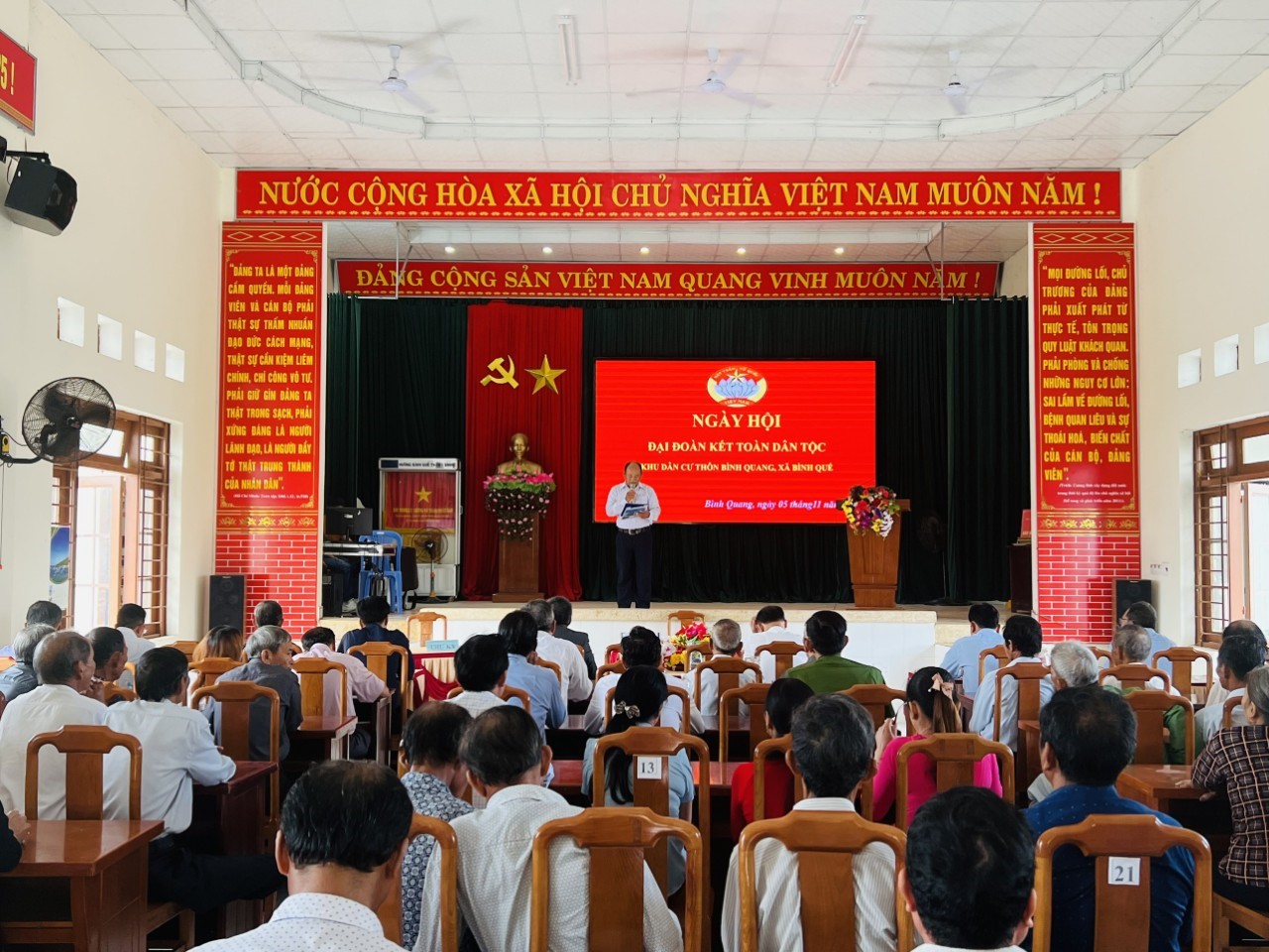 Phát biểu tại ngày hội ở thôn Bình Quang, Phó Bí thư Thường trực Huyện uỷ Lê Quang Hạt đề nghị cấp uỷ, chính quyền, Mặt trận Tổ quốc, các tổ chức đoàn thể từ xã đến thôn tiếp tục nâng cao năng lực lãnh đạo, sức chiến đấu; mỗi cán bộ, đảng viên, đoàn viên, hội viên nêu cao tinh thần tiên phong gương mẫu, đi đầu trong mọi lĩnh vực đời sống xã hội, tiếp tục tuyên truyền, vận động, thuyết phục hội viên, đoàn viên, nhân dân thực hiện tốt các chủ trương của Đảng, chính sách và pháp luật của Nhà nước; tích cực tham gia các phong trào thi đua, thực hiện thắng lợi các nhiệm vụ phát triển kinh tế - xã hội. Triển khai thực hiện tốt Đề án phát triển kinh tế vùng Tây. Tập trung vận động bà con nhân dân thực hiện tốt công tác bảo vệ môi trường, phòng chống dịch bệnh, nhất là công tác tiêm phòng vắc xin Covid-19, huy động người dân diệt bọ gậy, lăng quăng phòng chống sốt xuất huyết; tích cực tham gia phòng, chống tội phạm, tệ nạn xã hội, kịp thời thông tin để xử lý các vi phạm về an ninh trật tự, vận động thanh niên thực hiện tốt việc lên trạm khám tuyển nghĩa vụ quân sự năm 2023. Tập trung giải quyết kịp thời các vấn đề vướng mắc, tâm tư, nguyện vọng chính đáng của nhân dân. Tiếp tục phát huy tinh thần đoàn kết, tương thân, tương ái của dân tộc, “lá lành đùm lá rách”, huy động các nguồn lực của xã hội để chăm lo, hỗ trợ người nghèo, người có hoàn cảnh khó khăn, trong đó chú trọng hỗ trợ về phát triển sản xuất, giảm nghèo bền vững; củng cố, nâng cao chất lượng thôn văn hóa; xây dựng thành công xã nông thôn mới...