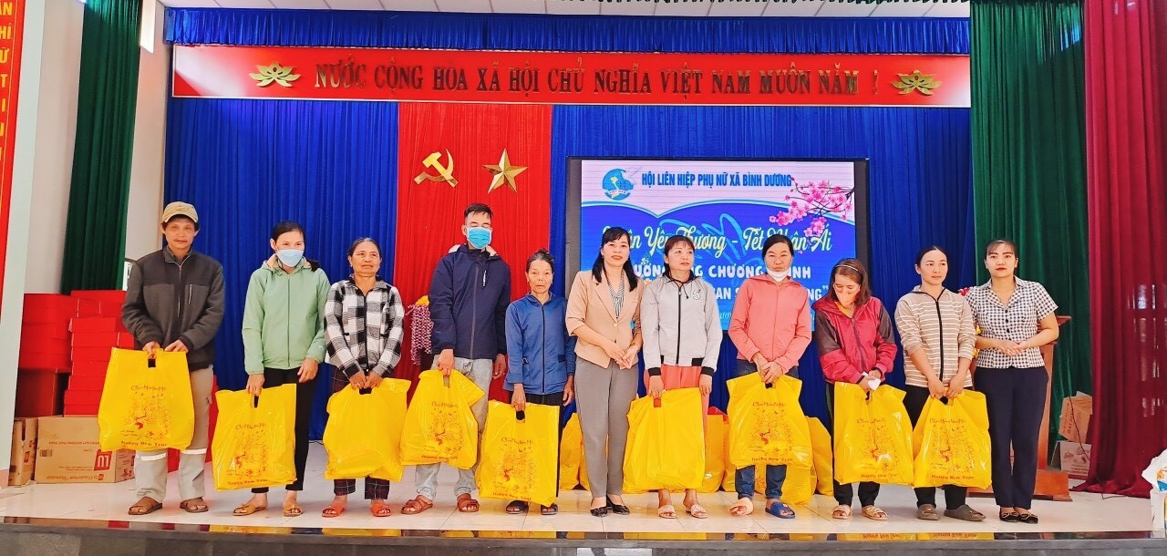 Hưởng ứng Chương trình “Triệu phần quà san sẽ yêu thương", Hội LHPN xã Bình Dương, xã Bình Định Bắc tổ chức Chương trình “Xuân yêu thương – Tết nhân ái” trao 60 suất quà cho gia đình HVPN nghèo, khó khăn. Mỗi suất quà trị giá từ 300.000 - 350.000 đồng. Tổng cộng trên 20 triệu đồng.