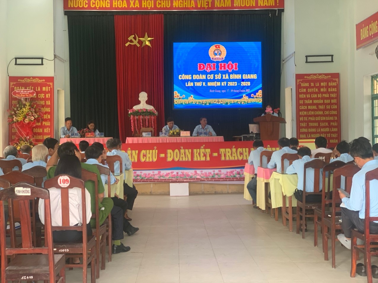 Công đoàn xã Bình Giang có tổng số 45 cán bộ, công chức, cán bộ không chuyên trách và người lao động. Nhiệm kỳ qua, Công đoàn xã đã tích cực đổi mới nội dung, phương thức hoạt động, khẳng định rõ vai trò đại diện và bảo vệ quyền và lợi ích hợp pháp, chăm lo đời sống cho đoàn viên, tích cực tham gia gia xây dựng Đảng, chính quyền. Hàng năm, Ban chấp hành Công đoàn phối hợp với UBND xã tổ chức hội nghị cán bộ, công chức đảm bảo công khai, dân chủ. BCH Công đoàn xã thường xuyên nắm bắt tâm tư nguyện vọng của đoàn viên Công đoàn, tham mưu với Đảng ủy, UBND xã thực hiện tốt chế độ chính sách tiền lương, xét khen thưởng, tổ chức thăm hỏi đoàn viên, tặng quà nhân các dịp ngày Lễ, Tết; tiếp nhận và tổ chức trao quà cho công nhân viên chức lao động có hoàn cảnh khó khăn.
