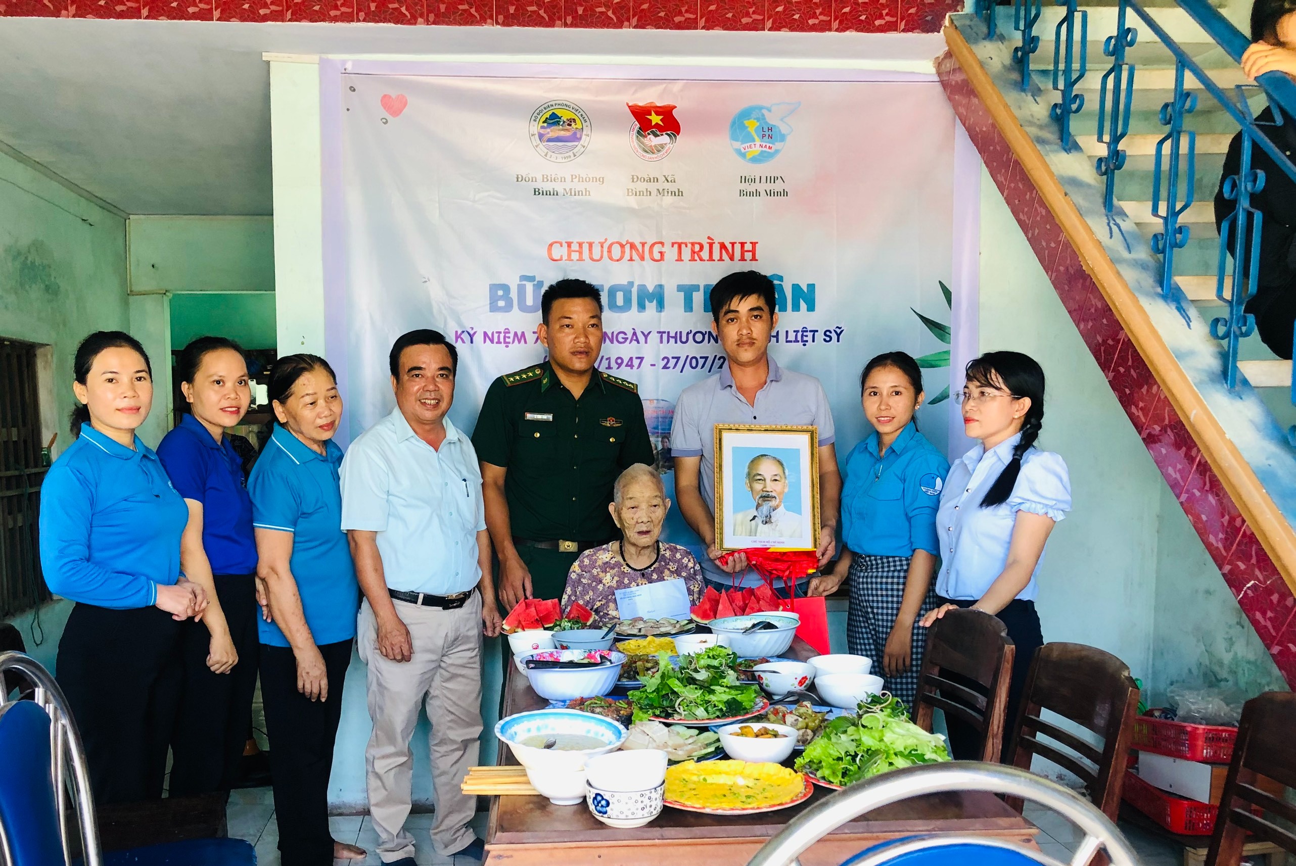 Cùng ngày, Hội LHPN xã Bình Minh phối hợp Đoàn Thanh niên xã, Đồn Biên Phòng Bình Minh tổ chức “Bữa cơm tri ân” tại nhà Mẹ Cao Thị Trí là vợ liệt sĩ ở tổ 6 thôn Tân An. Dịp này, Hội đã trao quà và sổ tiết kiệm cho Mẹ trị giá 1,5 triệu đồng.