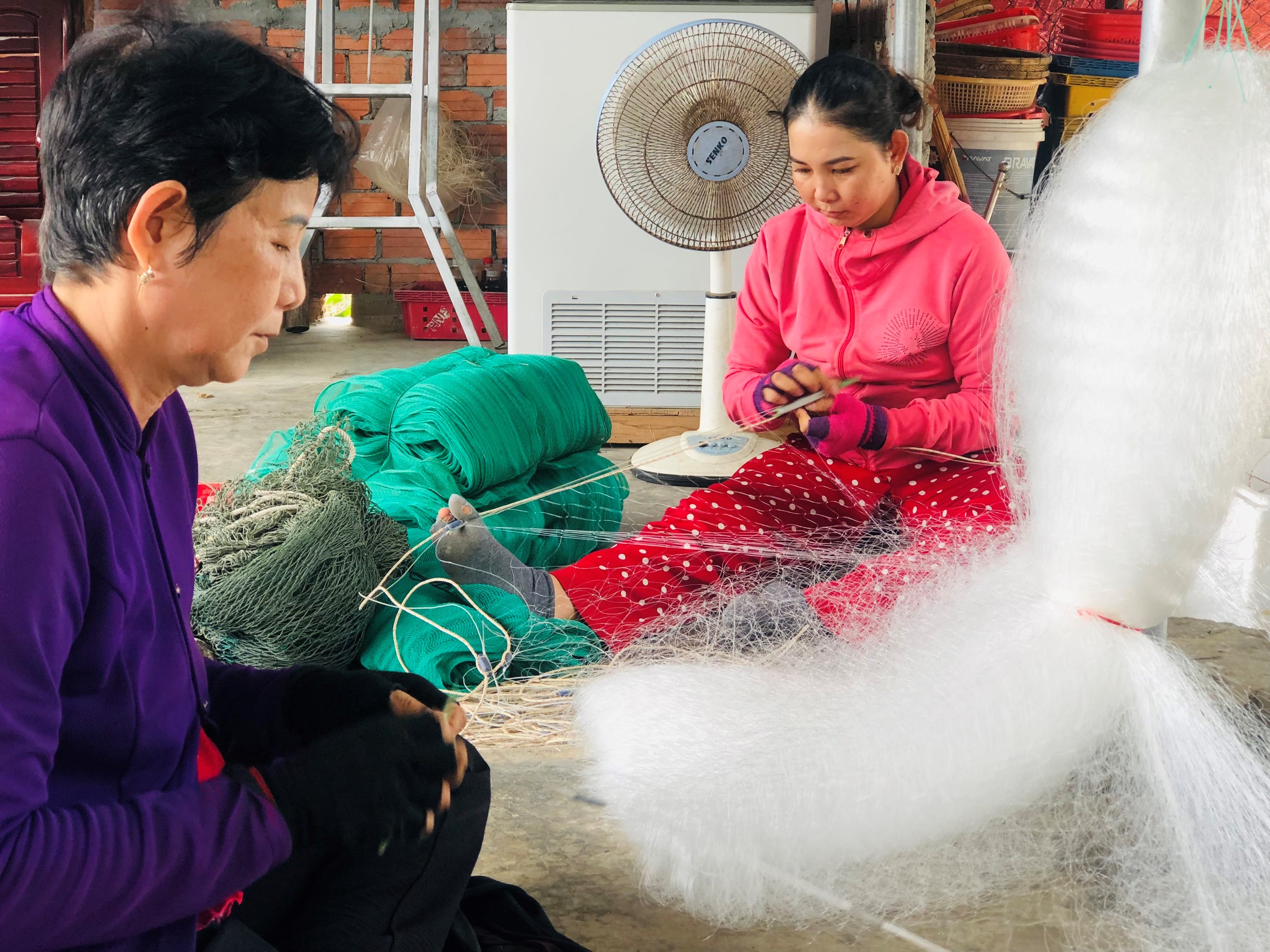 (Ảnh: Hội LHPN xã hỗ trợ dụng cụ đan lưới cho người dân tại địa phương)