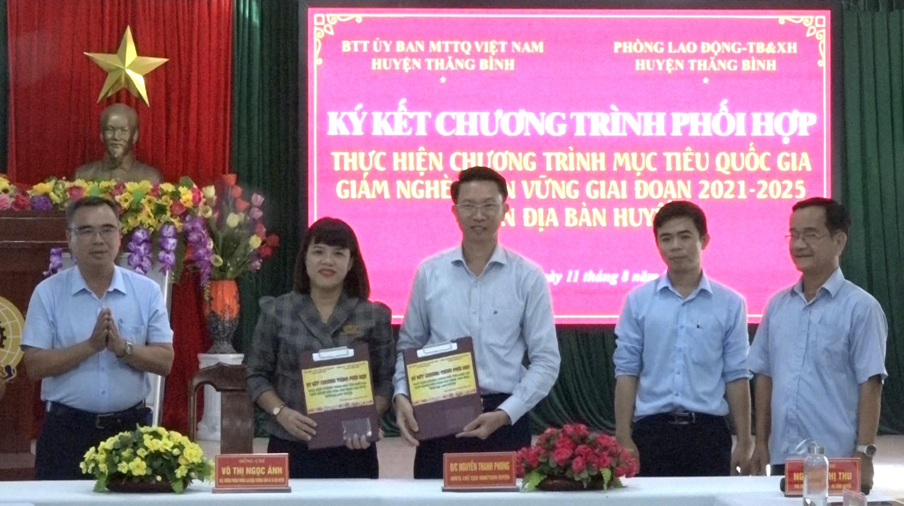 Theo đó, Ủy ban MTTQ Việt Nam huyện và Phòng Lao động - Thương binh & Xã hội huyện tổ chức ký kết Chương trình phối hợp thực hiện Chương trình mục tiêu quốc gia giảm nghèo bền vững giai đoạn 2021-2025 trên địa bàn huyện Thăng Bình.
