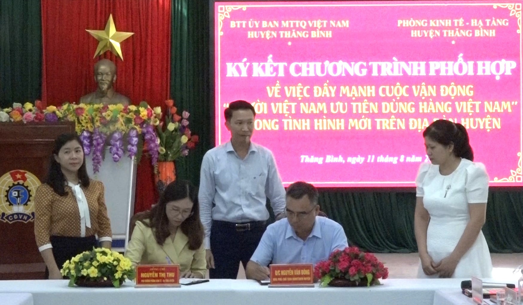 * Cũng trong chiều ngày 11.8, Ủy ban MTTQ Việt Nam huyện và Phòng Kinh tế - Hạ tầng huyện tổ chức ký kết Chương trình phối hợp về việc đẩy mạnh Cuộc vận động “Người Việt Nam ưu tiên dùng hàng Việt Nam” trong tình hình mới trên địa bàn huyện Thăng Bình.