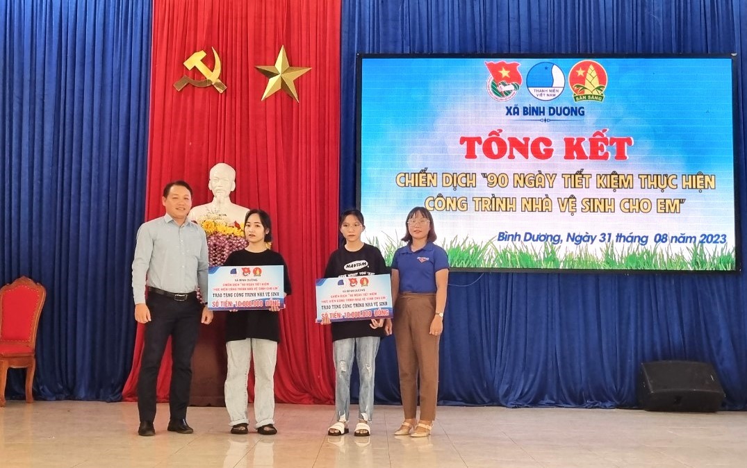 Theo đó, sau 90 ngày kêu gọi đoàn viên, thanh thiếu niên nhi đồng xã Bình Dương thực hiện tiết kiệm chỉ từ 1.000 đồng đến 2.000 đồng để nuôi heo đất, chiến dịch đã thu được số tiền 20.050.000 đồng. Số tiền huy động đợt này, Đoàn xã Bình Dương đã trao hỗ trợ cho hộ bà Hồ Thị Lào và hộ bà Phan Thị Hội là gia đình có hoàn cảnh khó khăn chưa có nhà vệ sinh, mỗi hộ 10 triệu đồng để làm công trình nhà vệ sinh cho em.