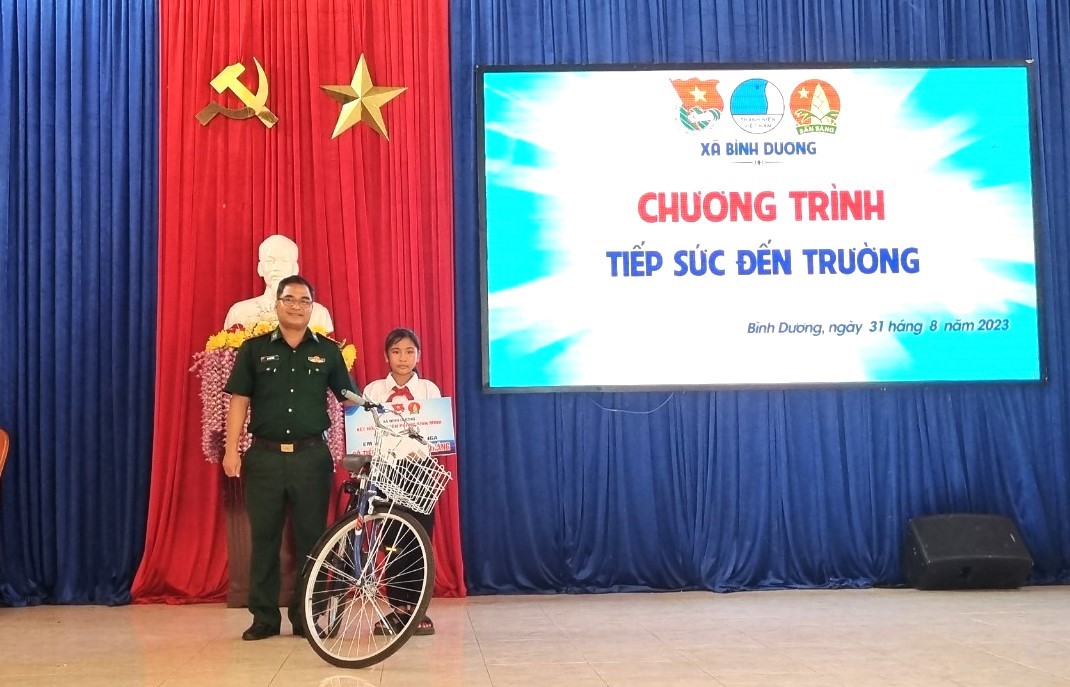Trong chương trình tiếp sức em đến trường, Đoàn xã Bình Dương đã vận động nguồn quỹ “Áo xanh, đồng hành chia sẻ” trao 20 suất quà cho các em học sinh có hoàn cảnh khó khăn nhân dịp năm học mới 2023 - 2024.