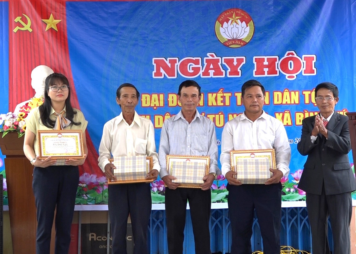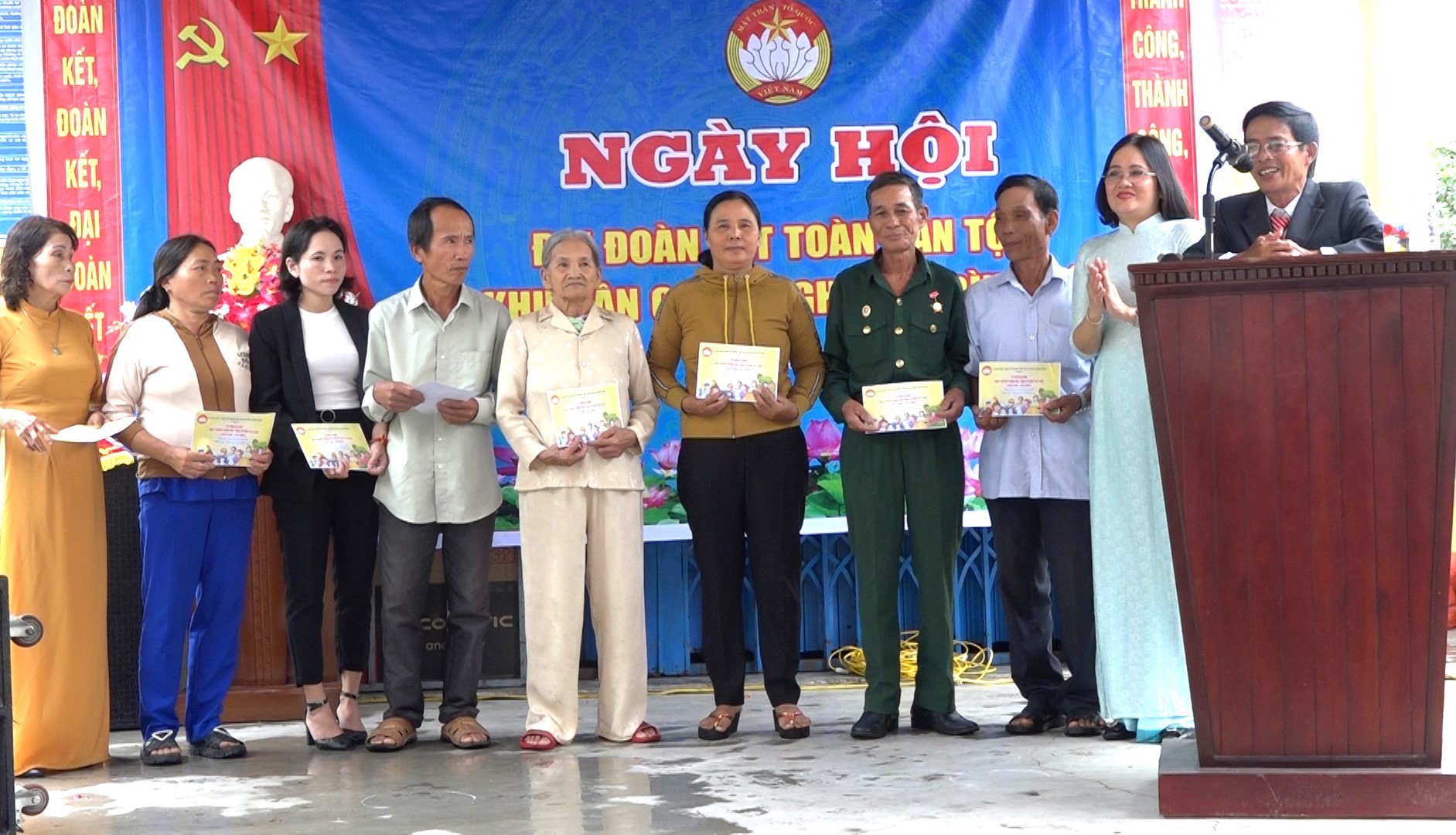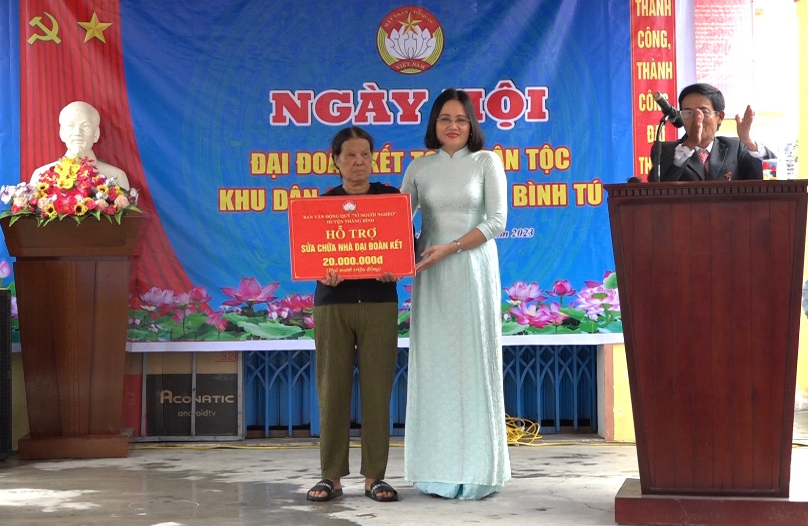 Về dự và chung cùng ngày hội, bà Phan Thị Nhi – Phó Chủ tịch UBND huyện trao biểu trưng (20 triệu đồng) sửa chữa 1 nhà đại đoàn kết và 10 suất quà cho các hộ gia đình có hoàn cảnh khó khăn. Đồng thời gửi lời động viên bà con nhân dân KDC Tú Nghĩa giữ vững truyền thống đoàn kết, phát huy sức mạnh, chủ động tích cực tham gia thực hiện tốt nhiệm vụ phát triển kinh tế, xã hội, tham gia giữ vững an ninh chính trị, trật tự an toàn xã hội địa bàn thời gian đến.