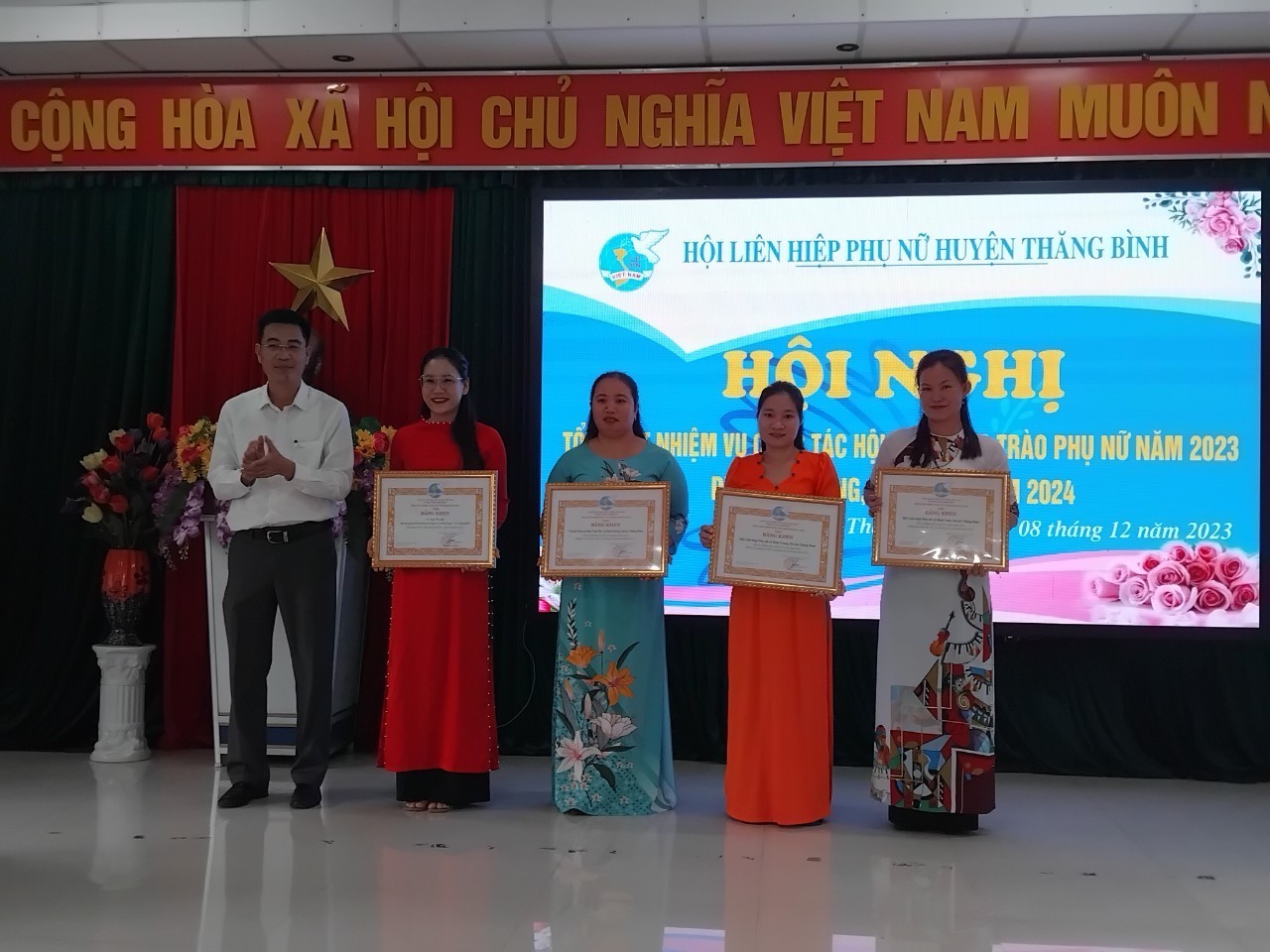 (Ảnh: Phó Bí thư Huyện uỷ Nguyễn Đức Bình trao bằng khen của Hội LHPN tỉnh cho các đơn vị có thành tích xuất sắc năm 2023)