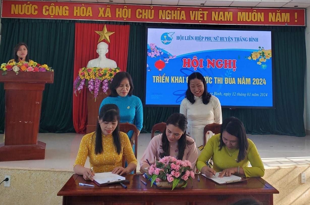 Về nhiệm vụ trọng tâm trong năm 2024, Hội LHPN huyện tiếp tục triển khai thực hiện Nghị quyết Đại hội đại biểu Phụ nữ các cấp, nhiệm kỳ 2021- 2026 gắn với thực hiện nhiệm vụ chính trị của địa phương. Hội nghị xác định và quán triệt nội dung các phong trào thi đua, các khâu đột phá, cuộc vận động và 3 nhiệm vụ trọng tâm của Hội; bám sát chủ đề thi đua năm 2024 là “Tăng cường ứng dụng công nghệ thông tin trong hoạt động Hội”. Theo đó, năm 2024 Hội đề ra và quyết tâm thực hiện đạt các chỉ tiêu như: 100% Hội LHPN xã, thị trấn phối hợp với các ban, ngành, tổ chức chính trị - xã hội tại địa phương tổ chức ít nhất 01 hoạt động nhằm nâng cao kiến thức, kỹ năng ứng dụng CNTT cho hội viên, phụ nữ; mỗi cơ sở Hội giúp đỡ ít nhất 02 hộ thoát nghèo bền vững, giúp ít nhất 01 phụ nữ khởi nghiệp có địa chỉ cụ thể; duy trì và nhận đỡ đầu thêm ít nhất 02 em đến 18 tuổi; nâng cao chất lượng thực hiện CVĐ “Xây dựng gia đình 5 không, 3 sạch”, ra mắt mô hình “Xây dựng gia đình 5 có, 3 sạch” có hiệu quả; đảm nhận phần việc xây dựng tuyến đường Phụ nữ tự quản “Sáng, xanh, sạch, đẹp” góp phần xây dựng nông thôn mới, đô thị văn minh.