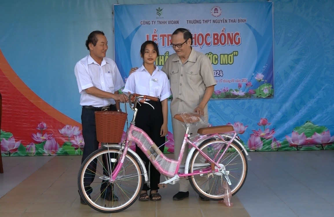 Dịp này, Hội Khuyến học huyện Thăng Bình và Công ty TNHH Thương mại Duyên Hoa, ở thị trấn Hà Lam còn trao 1 chiếc xe đạp và 2 triệu đồng hỗ trợ học sinh khó khăn dịp tết nguyên đán Giáp Thìn 2024.