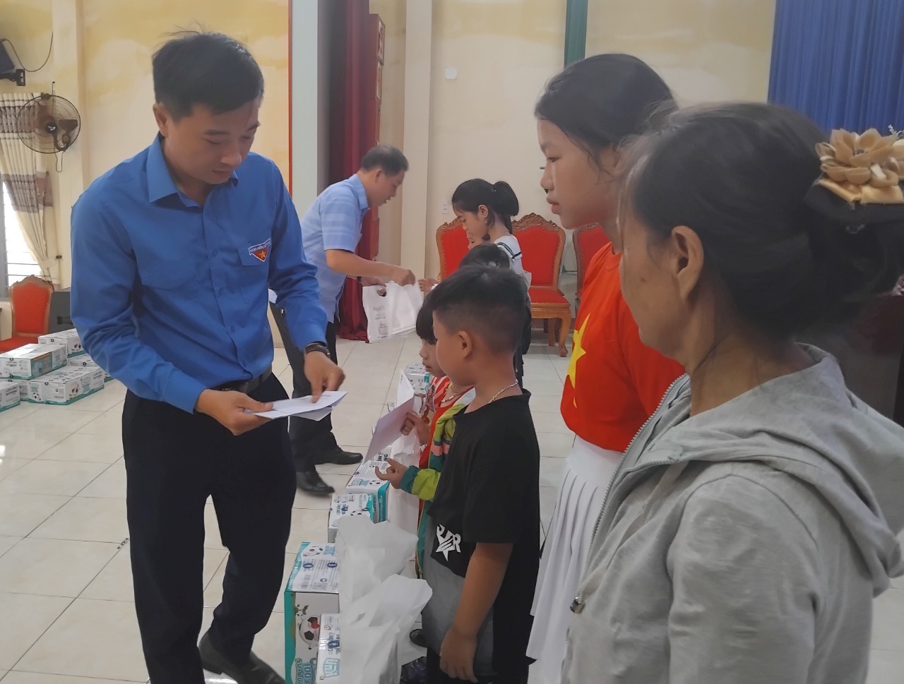 (Ảnh: Đồng chí Đoàn Thiện Ngọc Vũ - HUV, Bí thư Huyện đoàn tặng quà cho học sinh)