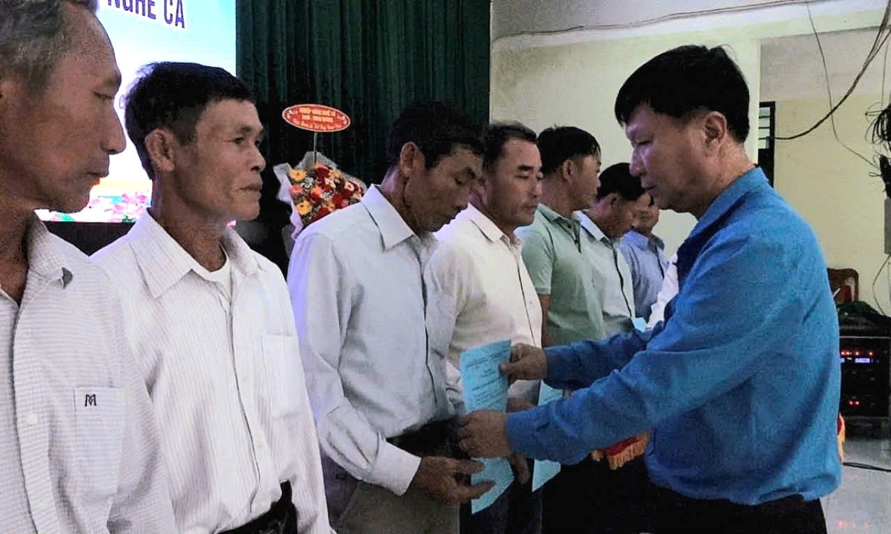 Ông Lưu Văn Thương - Phó Chủ tịch Liên đoàn lao động tỉnh Quảng Nam trao tặng cờ Tổ quốc cho đoàn viên Nghiệp đoàn nghề cá xã Bình Hải (Thăng Bình).