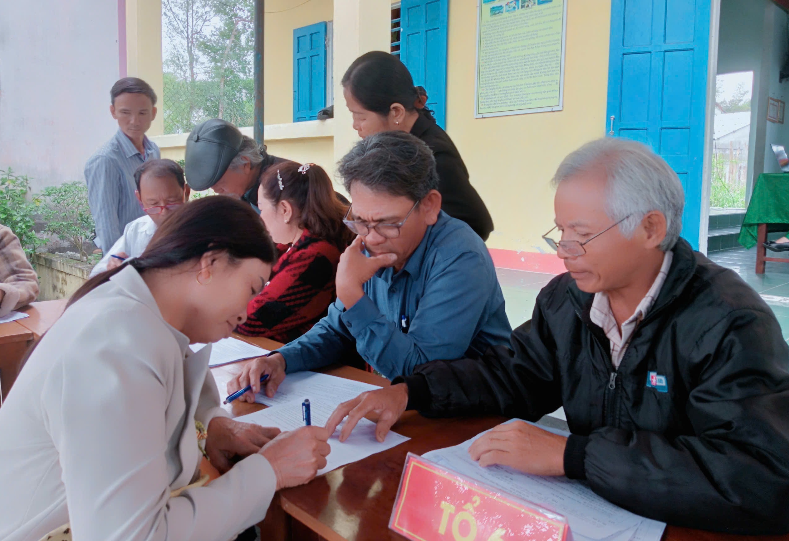 (Ảnh: Người dân thôn Đông Tác, xã Bình Nam tham gia lấy ý kiến theo mẫu phiếu)