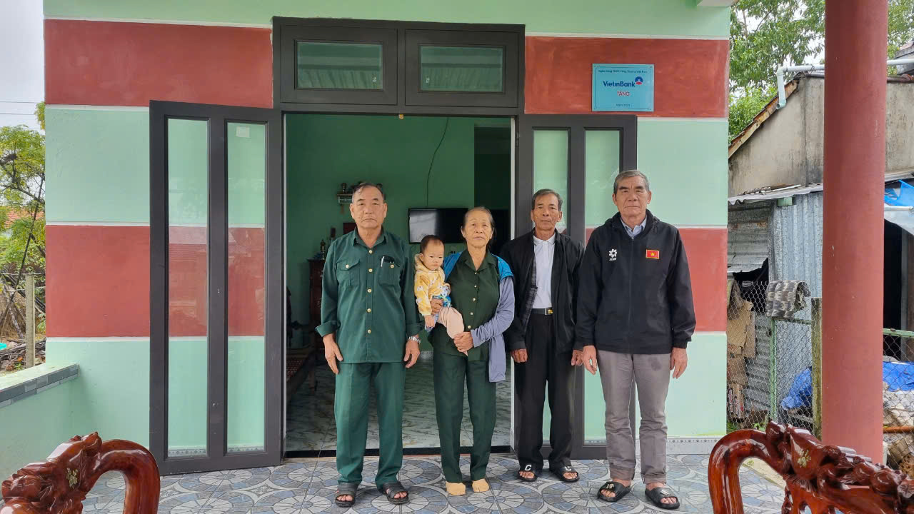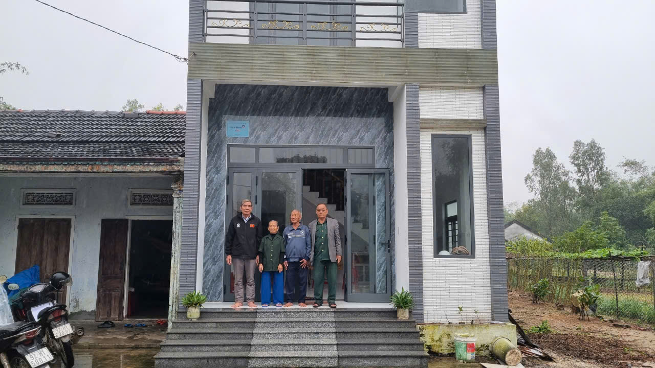 Nhà "Nghĩa tình đồng đội" của bà Trần Thị Lợp (người phụ nữ trong hình) được xây bên cạnh ngôi nhà cấp 4 đã xuống cấp