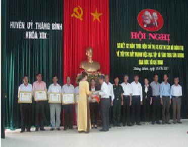 Phó BT Huyện ủy Hồng Quốc Cường trao giấy khen cho các cá nhân có thành tích xuất sắc sau 2 năm thực hiện chỉ thị 03-CT/TW của Bộ Chính trị. Ảnh H.N
