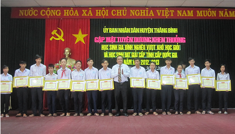 Quê nghèo Thăng Bình luôn có truyền thống hiếu học. Chất lượng giáo dục các cấp học không ngừng được tăng lên trong những năm gần đây. Bậc THCS liên tục 8 năm liền luôn được xếp vào tốp huyện dẫn đầu toàn đoàn về thi học sinh giỏi lớp 9 của tỉnh. Tỷ lệ học sinh thi đỗ vào các trường Đại học, Cao đẳng ngày càng tăng. Đặc biệt liên tục 6 năm gần đây năm nào Thăng Bình cũng có thủ khoa trong các kỳ thi đại học, cao đẳng. Trong kỳ thi Đại học và Cao đẳng năm 2013 này,chỉ tính riêng Trường THPT Tiểu La đã có 4 em đạt từ 28 điểm trở lên vào các trường Đại học tốp đầu của cả nước. Riêng em Xa Thành Luân thi đỗ vào khoa công nghệ thông tin Đại học Bách khoa Đà Nẵng, còn đỗ thủ khoa Cao đẳng công nghệ cũng của trường này với số điểm là 29,5, nằm trong tốp 100 thủ khoa cao điểm nhất nước. Nhà Luân cũng không mấy khá giả, mẹ thường xuyên đau ốm, bản thân Luân bị bệnh đang phải nhờ các thanh đỡ bằng kim loại nâng lồng ngực trong cơ thể. Tính cần cù chịu khó đã giúp Luân vượt lên bệnh tật, đạt kết quả cao trong kỳ thi. Một thủ khoa khối C khoa Tiểu học của Trường Đại học Quảng Nam năm 2013 cũng là học sinh Thăng Bình. Đó là em Lê Thị Mỹ Hạnh thi khối C đạt 23 điểm (chưa tính điểm ưu tiên), học sinh trường THPT Lý Tự Trọng. Thầy giáo Lê Cao Lan, hiệu trưởng nhà trường cho biết gia đình em thuộc diện hộ nghèo, ba mất sớm, 3 chị em Hạnh vượt qua khó khăn vươn lên học tốt. Chị cả của Hạnh nay đã là giáo viên trung học. Khi vừa thi xong, Hạnh đi làm thuê tại Đà nẵng để có tiền ăn học. Biết mình đỗ thủ khoa, nhưng vì công việc em vẫn chưa thể về quê để vui cùng bạn bè. “Ai cũng biết sự học là vô cùng vất vả, đòi hỏi phải khổ luyện và phấn đấu bền bỉ mới thành công. Người có điều kiện thì học giỏi đã khó. Các em có hoàn cảnh khó khăn giàu ý chí, nghị lực đã vươn lên vượt qua mọi trở ngại, giành nhiều thành ích xuất sắc trong học tập rất đáng trân trọng” - Ông Trần Văn Thức, Phó Chủ tịch UBND huyện Thăng Bình nhận xét. /.