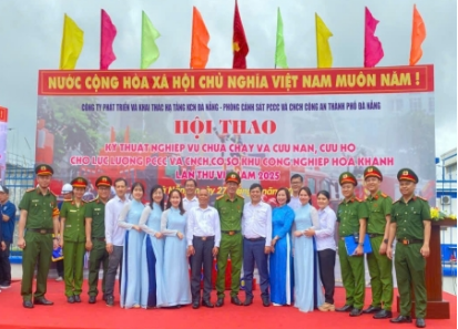(Đại úy Phan Trần Huy chụp ảnh lưu niệm (thứ 3 từ phải qua) tại Khai mạc Hội thao kỹ thuật nghiệp vụ chữa cháy và CNCH cho lực lượng PCCC cơ sở”)