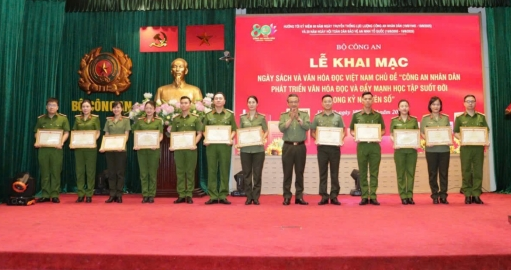 (Đại úy Phan Trần Huy (thứ 5 từ bên phải qua) nhận Giải thưởng cuộc thi Đại sứ Văn hóa đọc 2025 do Bộ Công an tổ chức)