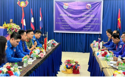 (Đại uý Phan Trần Huy (trang phục công an, cầm micro) tham gia buổi Hội đàm giữa tuổi trẻ tỉnh Quảng Nam và tuổi trẻ tỉnh Sê Kông, CHDCND Lào)