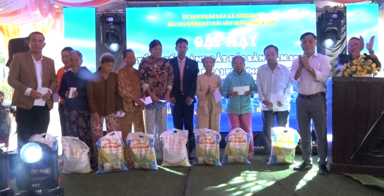 Dịp này UBND huyện Thăng Bình đã khen thưởng cho tập thể Tổ đoàn kết đánh bắt hải sản thôn Vịnh Giang; xã Bình Nam khen thưởng cho 5 ngư dân trong thôn đã có thành tích tốt trong việc tham gia đánh bắt hải sản năm 2022; Tổ đoàn kết đánh bắt hải sản thôn Vịnh Giang đã trao 11 suất quà cho các hộ dân có hoàn cảnh khó khăn của thôn.