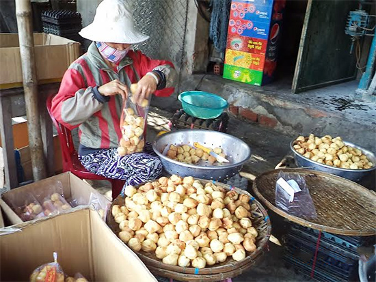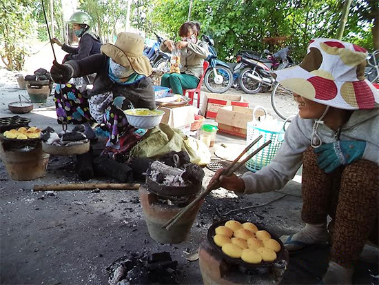 Khoảng sân rộng của nhà bà Bảy trở nên ấm hơn trong hơi lạnh ngày xuân bởi những lò than hồng. Những bà, chị chăm chú theo những mẻ bánh trên lò than đang tỏa ra hương thơm lừng của trứng gà. Tranh thủ dịp tết, gia đình bà Bảy nhận đánh trứng kiếm thêm vài đồng để chi tiêu dịp tết. Cứ một lượt đánh (2 ký bột, 2 ký trứng) bà lấy 5.000 - 7.000 đồng/lượt.