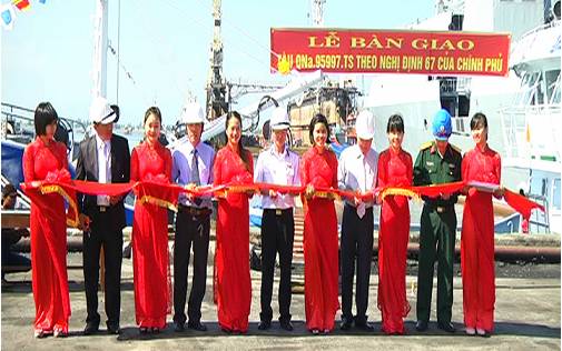 Ảnh: Cắt băng bàn giao tàu QNa 95997.TS cho ngư dân Phan Thu.