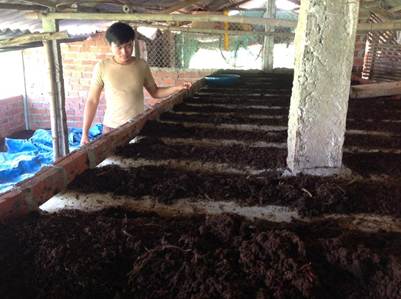 Ảnh: Anh Trúc đang kiểm tra khu vực nuôi giun!