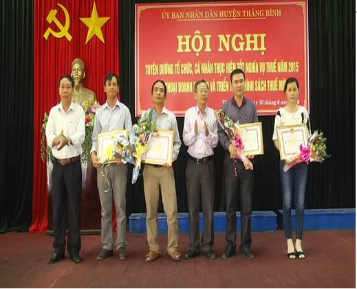 Tại hội nghị, Bộ Tài chính tặng bằng khen cho 1 tổ chức, UBND tỉnh Quảng Nam tặng bằng khen cho 1 cá nhân, Tổng Cục thuế khen thưởng cho 2 tổ chức và 2 cá nhân; Cục thuế tỉnh Quảng Nam khen thưởng 1 tổ chức, 12 cá nhân; huyện Thăng Bình khen thưởng 2 tổ chức, 2 cá nhân thực hiện tốt nghĩa vụ thuế năm 2015. Dịp này, Chi cục thuế huyện Thăng Bình cũng đã tổ chức đối thoại với các doanh nghiệp để trả lời những vướng mắc của doanh nghiệp về chính sách thuế và phổ biến các văn bản quy phạm pháp luật thuế, các văn bản có liên quan về thuế đến với doanh nghiệp.