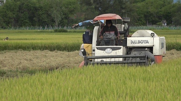 (Ảnh: Nông dân Thăng Bình đang khẩn trương thu hoạch lúa hè thu)
