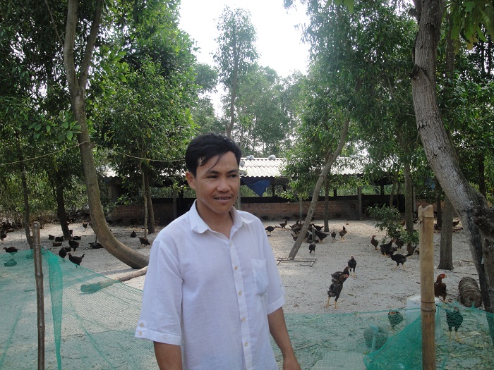 Ngoài trồng trọt, vợ chồng anh quyết định đầu tư chăn nuôi gà tập trung, với quy mô 3 lứa một năm, mỗi lứa khoảng 2.000 con. Chọn được giống gà kiến thùng mau lớn, dễ nuôi, anh đã đầu tư nuôi theo mô hình trang trại tập trung và đã ứng dụng đệm lót sinh học để đem lại hiệu quả kinh tế trong chăn nuôi. Theo tính toán, trung bình sau khi trừ các khoản, 1.000 con gà thịt sẽ đem lại cho gia đình anh nguồn thu nhập khoảng 15 triệu đồng. Để tăng thêm phần thu nhập, gia đình tổ chức nuôi heo thịt hướng nạc, trên 10 con mỗi lứa, một năm ba lứa. Trong chăn nuôi luôn tuân thủ quy trình kỹ thuật nuôi, nghiêm ngặt các khâu tiêm phòng, chăm sóc. Với kiến thức về nghề nuôi heo do tự học, tự nghiên cứu, kết hợp với kiến thức được hướng dẫn tập huấn do các cấp Hội Nông dân và ngành nông nghiệp chuyển giao, gia đình anh đã áp dụng các kỹ thuật mới như sử dụng nước thải khí sinh học Biogas được lọc trong để bổ sung dinh dưỡng cho vật nuôi, sử dụng quy trình lên men lỏng trong chăn nuôi heo, phối trộn thức ăn, nhờ vậy trọng lượng đàn heo tăng trưởng nhanh. Bình quân 01 năm thu nhập từ nuôi heo là hơn 30 triệu đồng.