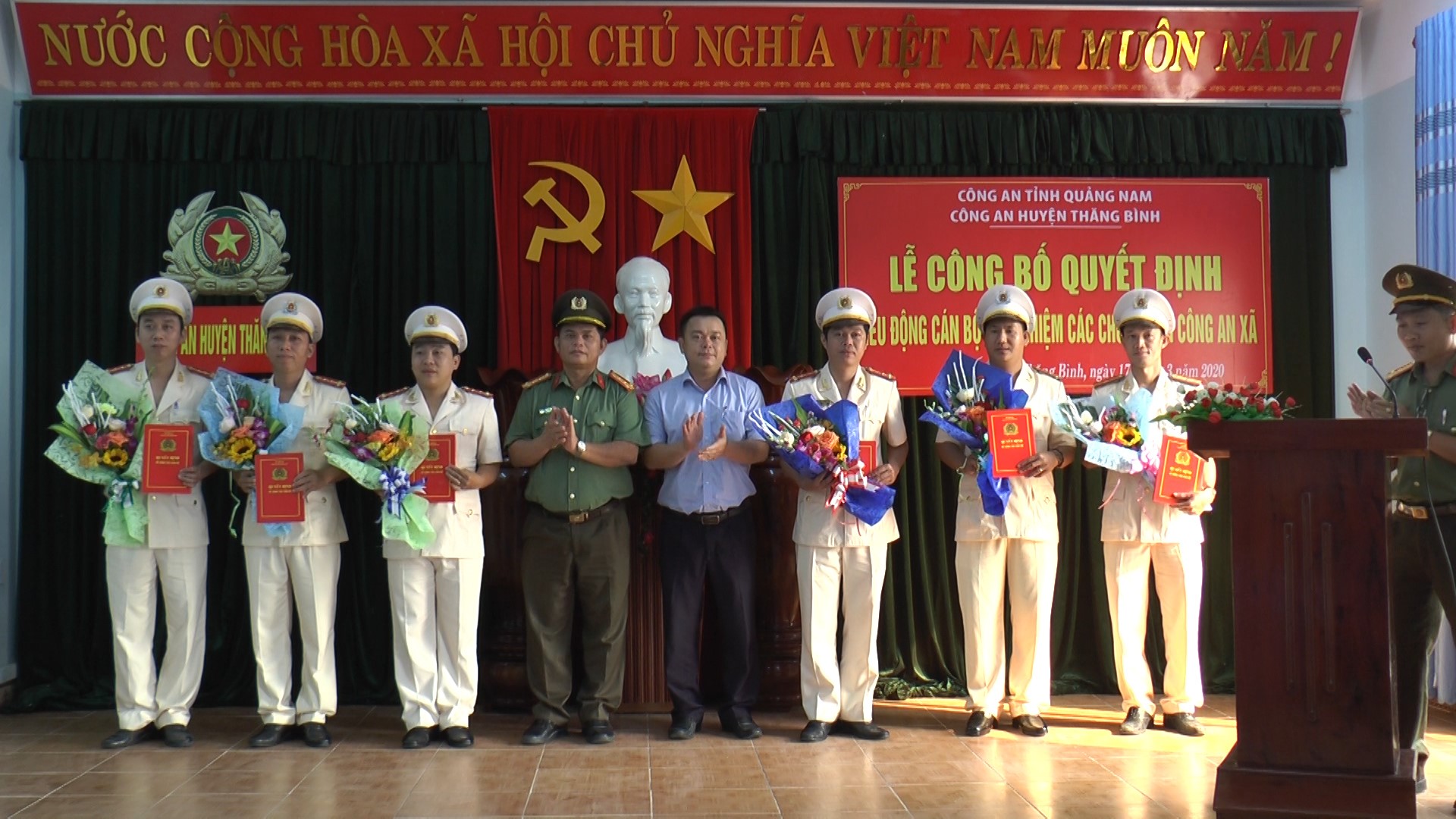 (Ảnh: Đại tá Huỳnh Sông Thu - TUV, Phó Giám đốc Công an tỉnh và lãnh đạo huyện Thăng Bình tặng hoa chúc mừng cán bộ chiến sĩ được điều động)