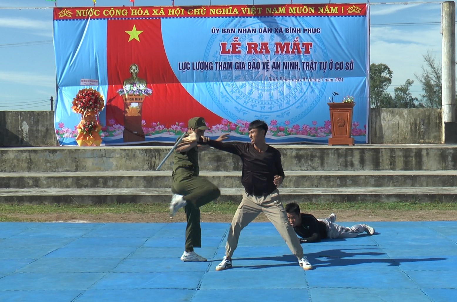 Buổi lễ đã thông tóm tắt nội dung Luật Lực lượng tham gia bảo vệ an ninh, trật tự ở cơ sở, các văn bản quy phạm pháp luật quy định thi hành Luật. Đặc biệt là công bố Quyết định thành lập các Tổ bảo vệ an ninh, trật tự và trao Quyết định công nhận các thành viên Tổ bảo vệ an ninh, trật tự trên địa bàn xã. Theo đó, Lực lượng tham gia bảo vệ an ninh, trật tự ở cơ sở xã Bình Phục có 12 người bố trí ở tại 4 thôn của xã. Trong buổi lễ ra mắt, Lãnh đạo huyện Thăng Bình cũng đã trao hoa, quà động viên tinh thần sẵn sàng thực hiện nhiệm vụ cho lực lượng tham gia bảo vệ an ninh, trật tự ở cơ sở.