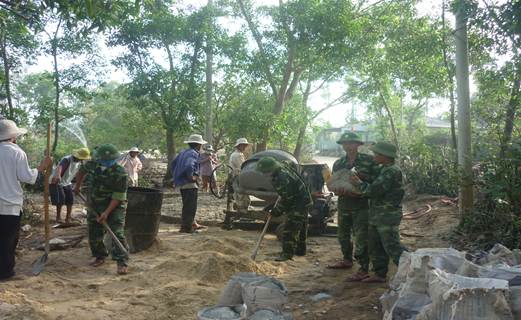 Ảnh: Cán bộ, chiến sĩ Đồn Biên phòng Bình Minh giúp dân là đường giao thông nông thôn
