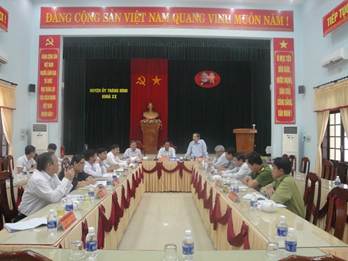 Tại buổi làm việc, đ/c Nguyễn Đức Tám- PBT Thường trực Huyện ủy đã báo cáo tóm tắt tình hình công tác nội chính và phòng, chống tham nhũng 6 tháng đầu năm 2016 của Huyện ủy. Nhìn chung, từ đầu năm đến nay, tình hình an ninh chính trị, trật tự an toàn xã hội trên địa bàn huyện cơ bản ổn định. Huyện ủy đã chỉ đạo triển khai thực hiện Chỉ thị 50-CT/TW của Bộ Chính trị về tăng cường sự lãnh đạo của Đảng đối với công tác phát hiện, xử lý vụ việc, vụ án tham nhũng. Công tác quốc phòng- an ninh được đảm bảo; Công an huyện thường xuyên phối hợp triển khai tốt kế hoạch phòng ngừa, đấu tranh trấn áp tội phạm, chủ động nắm tình hình, bảo đảm trật tự xã hội. Các cơ quan tố tụng pháp luật như Công an, Viện kiểm sát, Tòa án đã có sự phối hợp chặt chẽ từ khâu điều tra, truy tố, xét xử, giải quyết đúng người, đúng tội, chưa phát hiện trường hợp oan sai. Công tác thanh tra, tiếp công dân, giải quyết khiếu nại, tố cáo được các cấp, các ngành quan tâm giải quyết theo thẩm quyền, đúng quy định của pháp luật. Trong 6 tháng đầu năm 2016, toàn huyện tiếp 281 lượt, 305 người, 277 vụ; nội dung chủ yếu liên quan đến chế độ chính sách, tranh chấp đất đai, phản ánh và kiến nghị về bồi thường, giải phóng mặt bằng, tái định cư dự án đường dẫn cầu Cửa Đại, dự án đường Cao tốc Đà Nẵng- Quảng Ngãi,...