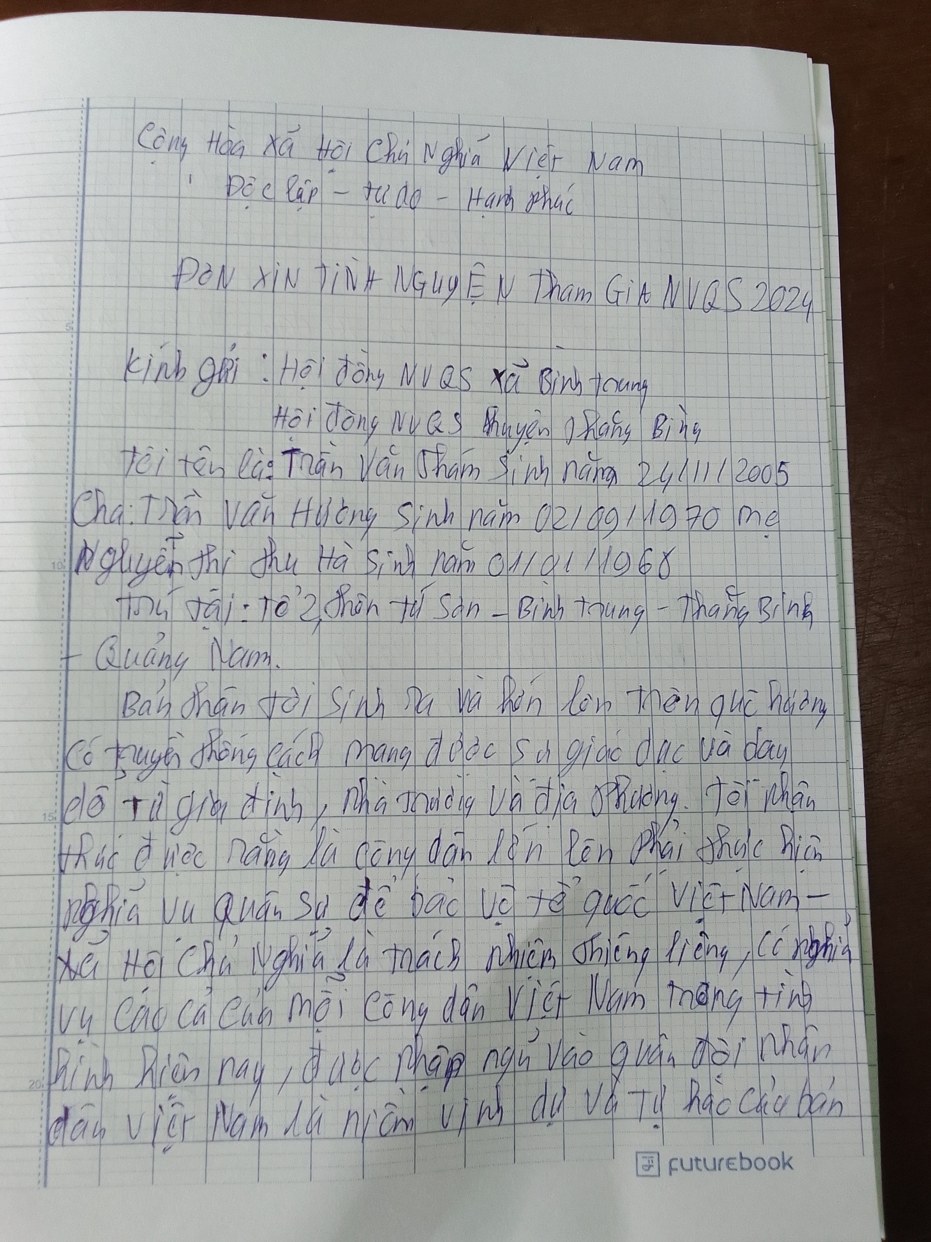 Trong lá đơn xin tình nguyện nhập ngũ gửi đến Hội đồng nghĩa vụ quân sự xã Bình Trung, em Trần Văn Thám (sinh năm 2005 thôn Tú Sơn xã Bình Trung) trình bày: thực hiện nghĩa vụ quân sự là trách nhiệm thiêng liêng, là nghĩa vụ cao cả của mỗi công dân Việt Nam trong tình hình hiện nay. Được nhập ngũ vào quân đội Nhân dân Việt Nam là vinh dự, là niềm tự hào của bản thân, gia đình. Tôi xin hứa tích cực học tập, phấn đấu trở thành chiến sĩ ưu tú trong quân đội và chấp hành nghiêm kỷ luật.