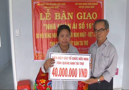 Đại diện lãnh đạo Liên hiệp các tổ chức hữu nghị tỉnh Quảng Nam trao biểu trưng hỗ trợ cho chị PhanThị Hướng.