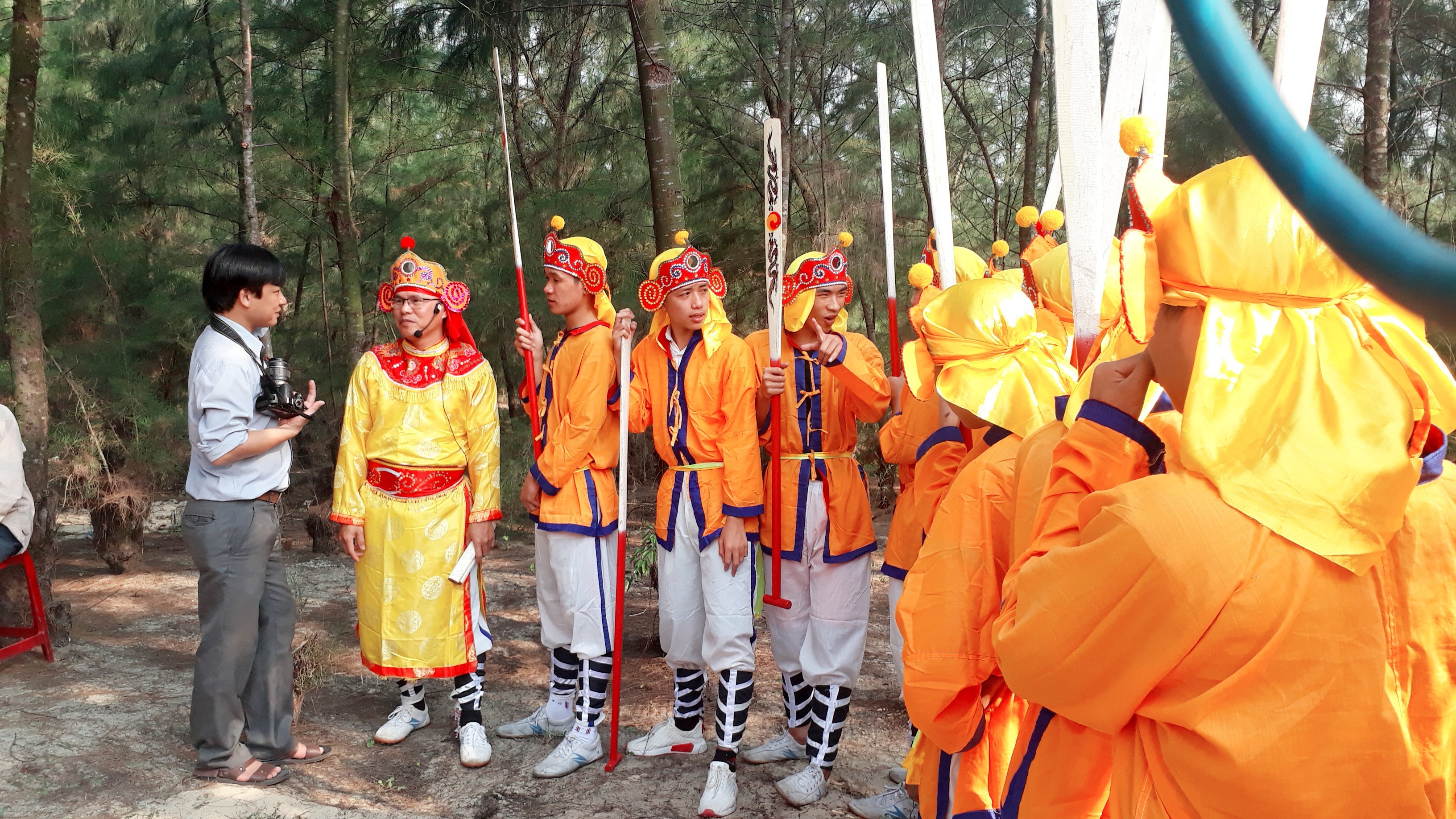 Ông Tám (thứ 2 trái sang) đang chuẩn bị đội hình để tham gia hát bả trạo tại lễ cầu ngư