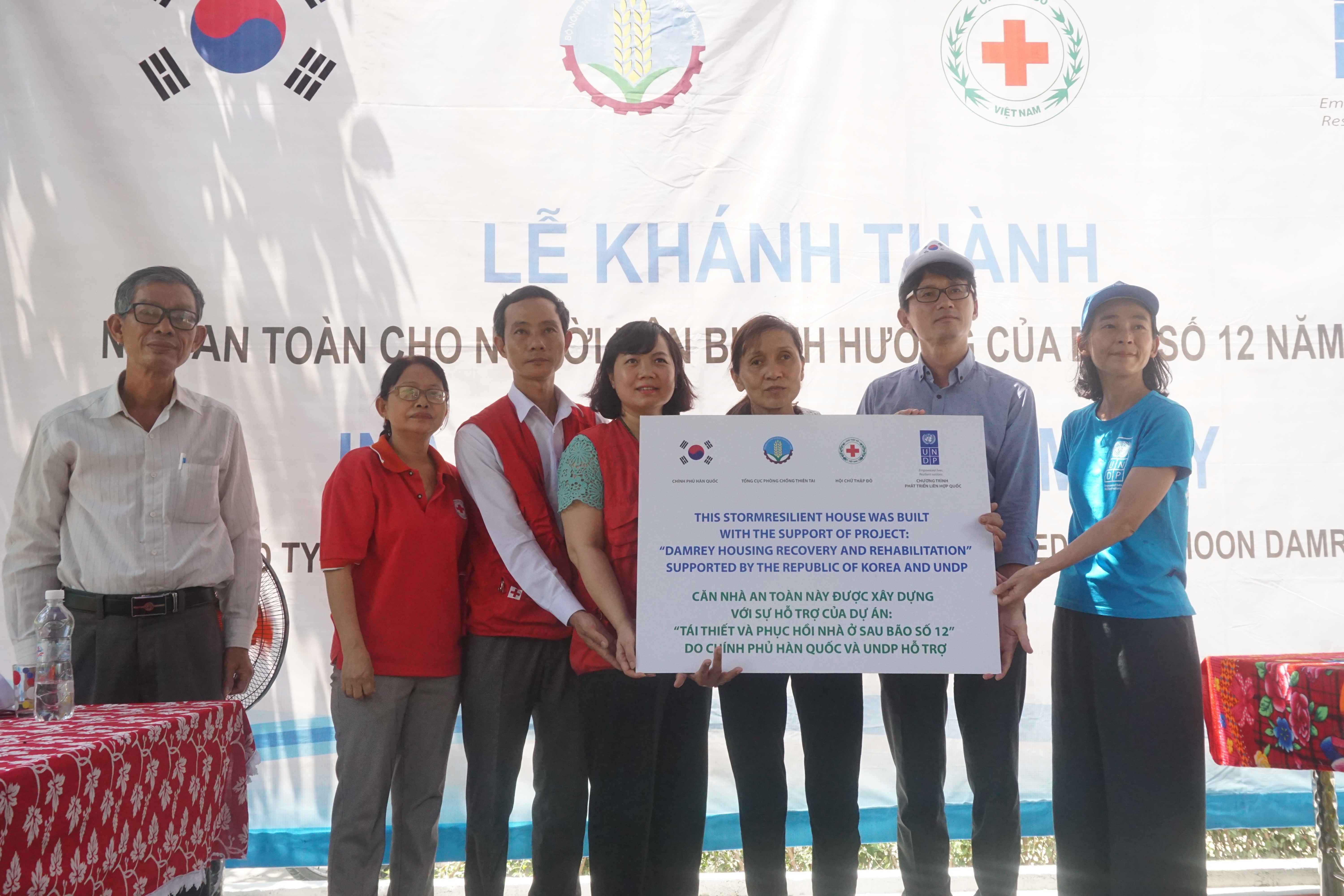Theo đó, 5 hộ gia đình được bàn giao nhà Phòng chống bão lụt gồm: bà Nguyễn Thị Thu (49 tuổi), ông Đỗ Văn Lợi (43 tuổi), bà Huỳnh Thị Liễu (73 tuổi), ông Trần Văn Trí (70 tuổi), tất cả cùng trú xã Bình Đào và bà Nguyễn Thị Thảo, trú xã Bình Nam; mỗi ngôi nhà trị giá gần 50 triệu đồng, từ nguồn “Tổ chức phát triển Liên hợp quốc (UNDP) tài trợ.